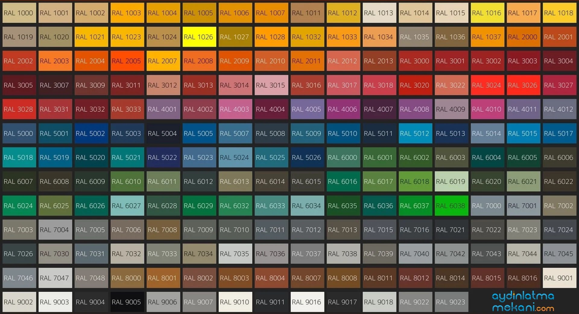 RAL, dünya genelinde kabul görmüş bir standart renk kodlama sistemidir. Bu sistem sayesinde sipariş verdiğiniz ürünün rengi, yalnızca görsele bağlı kalmadan, net bir kod ile birebir aynı tonda üretilir.