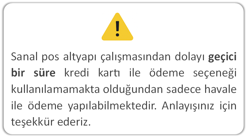 Sitemiz üzerinden kredi kartlarınız ile, online tek ödeme veya online taksit imkânlarından yararlanabilirsiniz. Online ödemelerinizde, siparişiniz sonunda kredi kartınızdan tutar çekim işlemi gerçekleşecektir.
